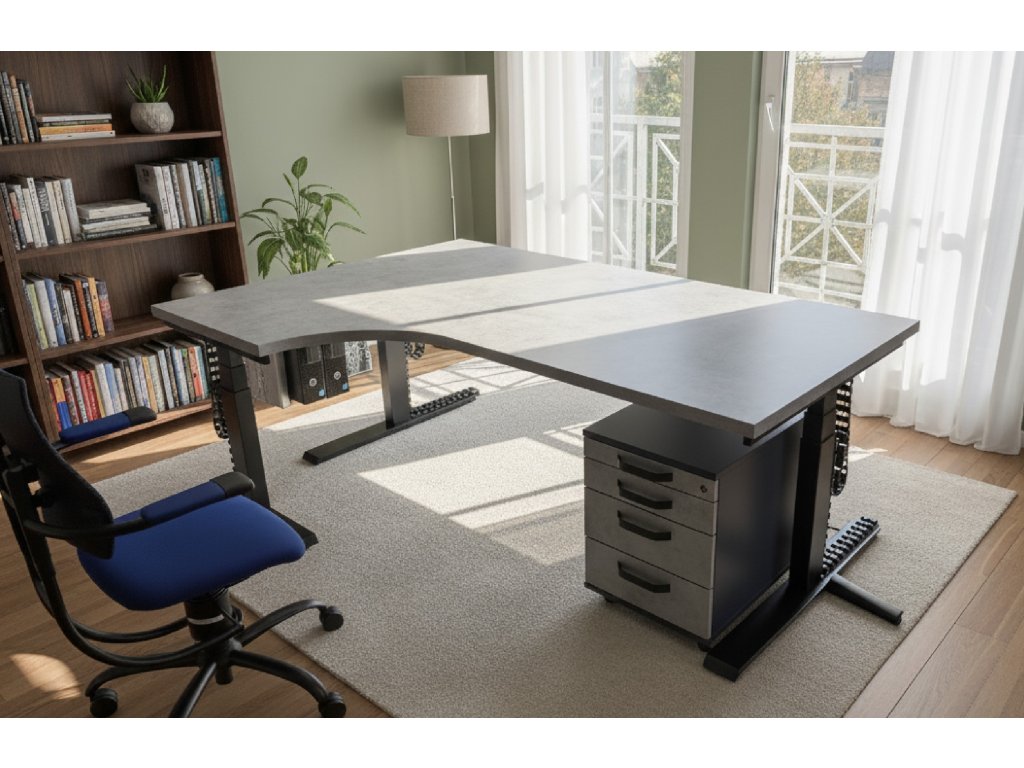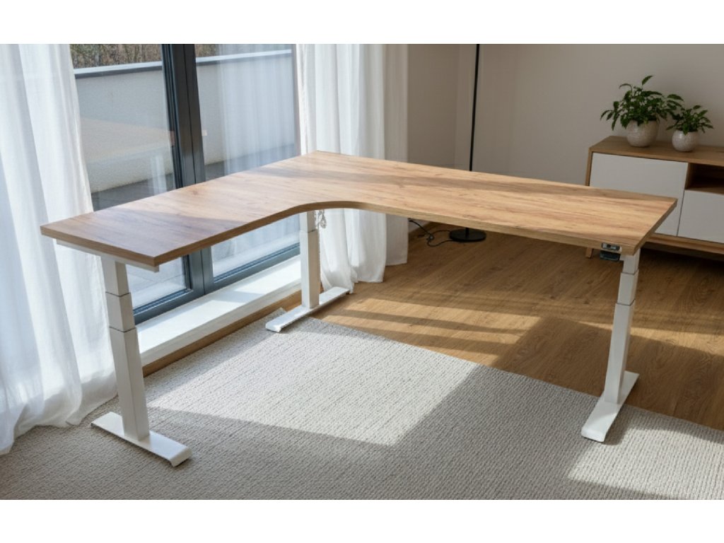 Výškově stavitelný stůl DeskTherapy D5+ v rohovém provedení s motory LINAK je profesionální zakázkový elektrický stůl, který vyniká moderním designem a pečlivým zpracováním.