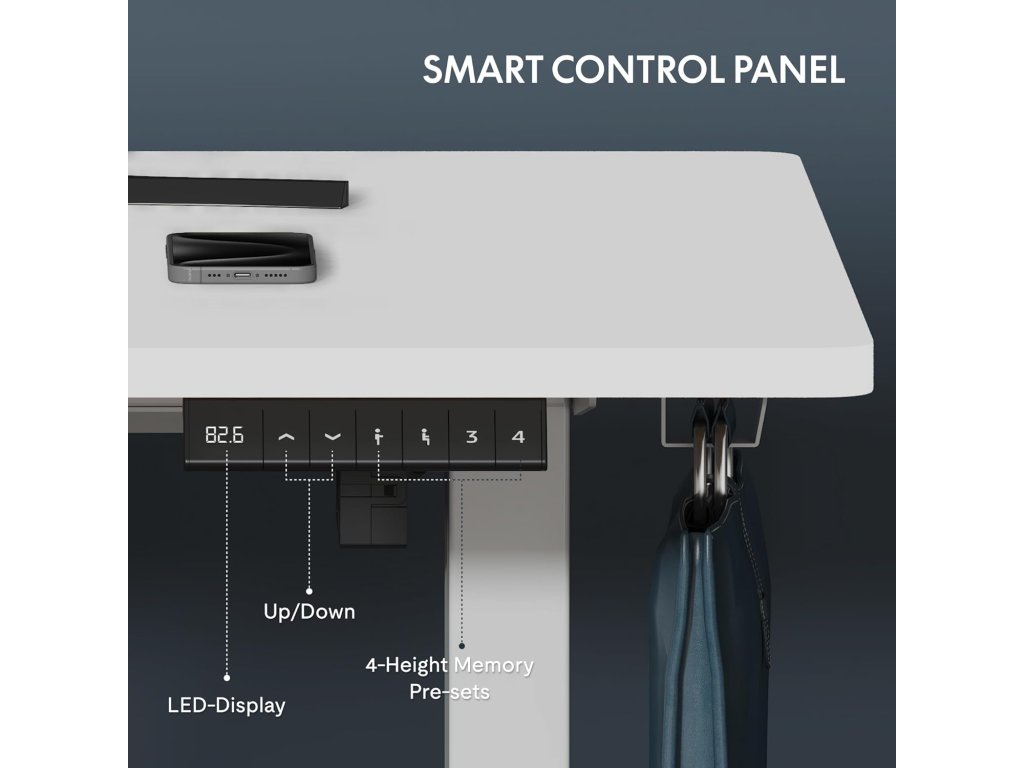 Díky předvrtaným otvorům, přehlednému návodu a dodanému nářadí zvládnete montáž bez problémů. Elektrické ovládání se dvěma tlačítky umožňuje plynulé nastavení výšky – přechod z pozice vsedě do stoje zvládnete za méně než 10 sekund.