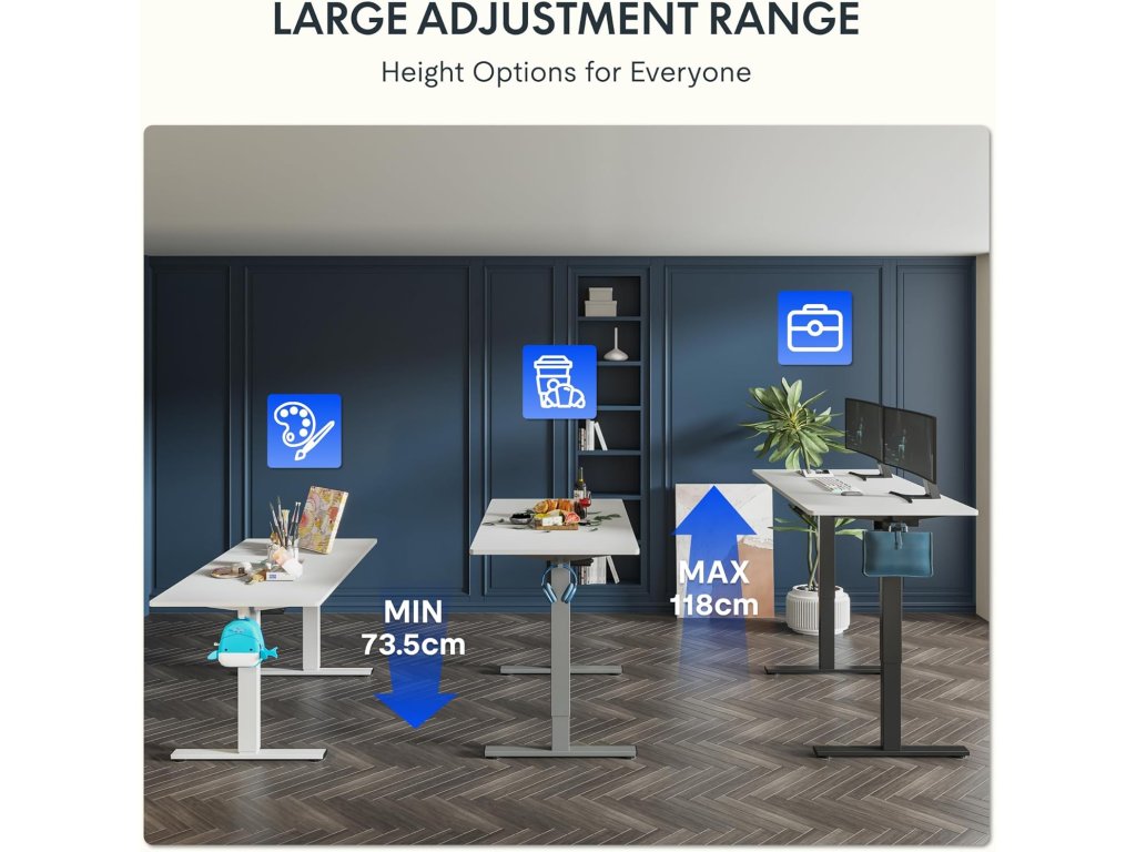 Stůl je vybaven výkonným motorem a nabízí extra velký rozsah výšky od 73,5 do 118 cm. Snadno si tak přizpůsobíte pracovní pozici podle své postavy i aktuální potřeby – ať už sedíte, stojíte nebo střídáte obojí. Ideální pro domácnosti i sdílené pracovní prostory.