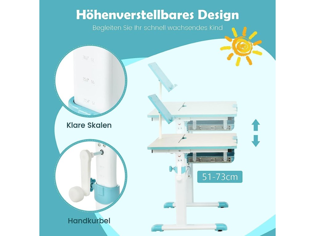 Díky výškově nastavitelnému designu se stůl snadno přizpůsobí aktuální výšce dítěte. Pomocí ruční kliky lze pracovní desku plynule zvedat nebo snižovat v rozmezí 51 až 73 cm, což zajišťuje ergonomické sezení po celé období školní docházky.