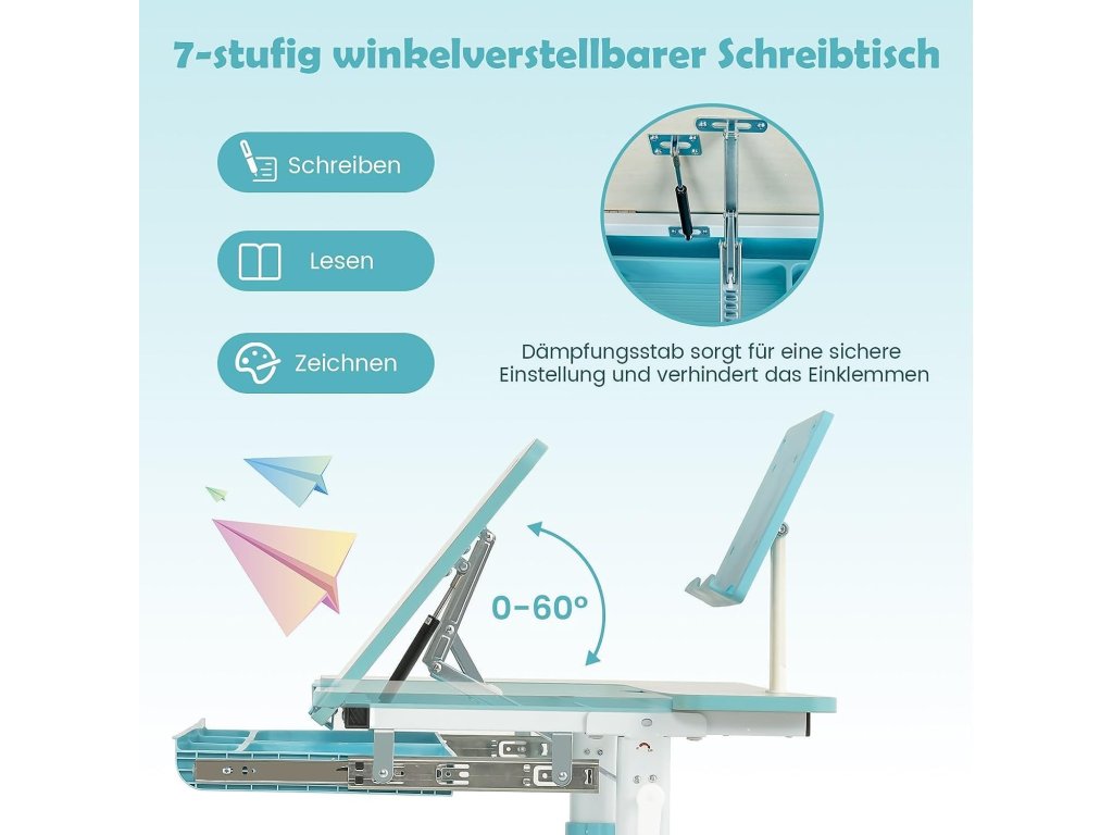 Psací plocha je výškově i úhlově flexibilní – nastavitelná v 7 krocích od 0 do 60°. Tím vyhovuje různým činnostem, jako je psaní, čtení nebo kreslení, a podporuje zdravé držení těla i soustředěnost při práci.