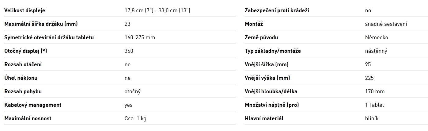 Profesionální nástěnný držák na tablet pro informační a prezentační využití v mnoha prostředích. Vhodný pro veletrhy, kanceláře, prodejní a výstavní prostory i pro náročnější provozy ve výrobě a logistice. Díky hloubce 23 mm umožňuje bezpečné použití tabletu i s ochranným krytem a nabízí jednoduchou montáž.
