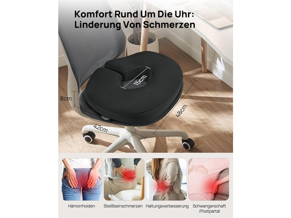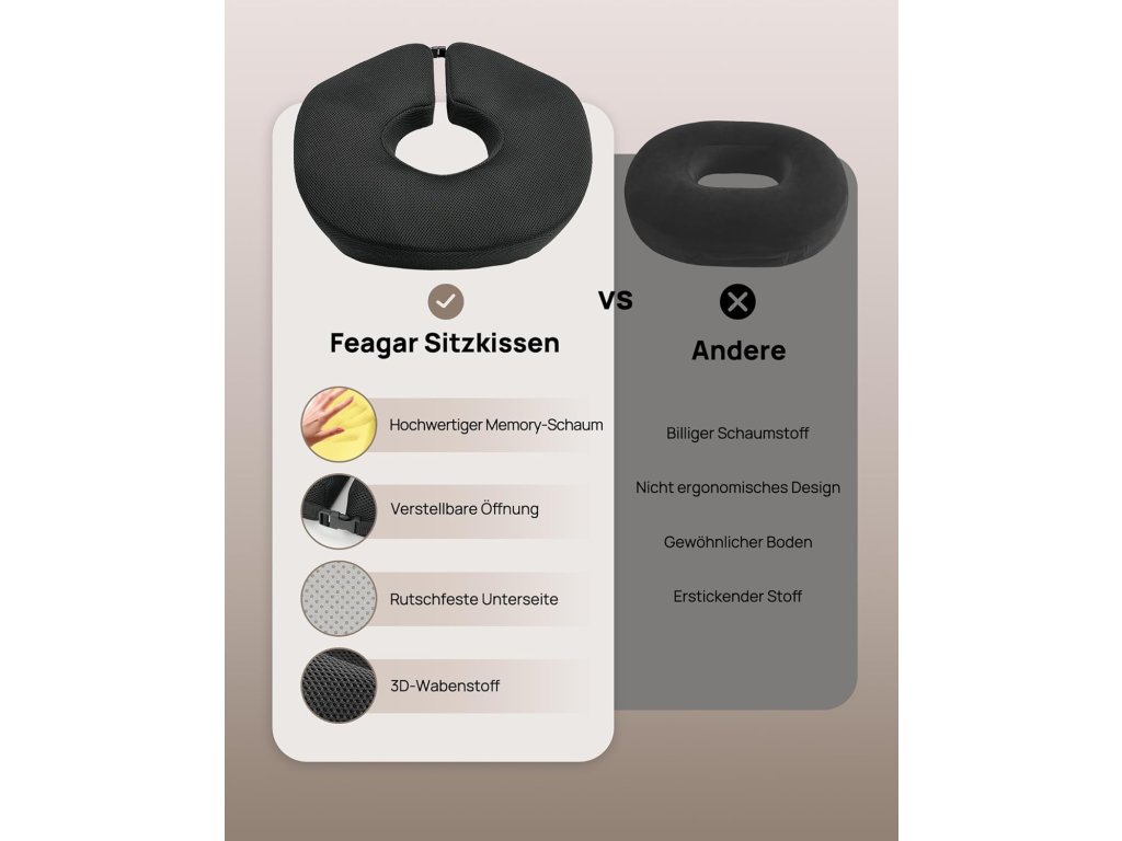 Sedák Feagar Hemoroid cíleně snižuje tlak na pánev, perineální oblast, ischiatický nerv a kostrč. Ideální při hemoroidech, bolesti prostaty, po zákrocích nebo při dlouhém sezení v kanceláři. Rozměry 48 × 42 × 8 cm poskytují extra velký, rozšířený komfort.
