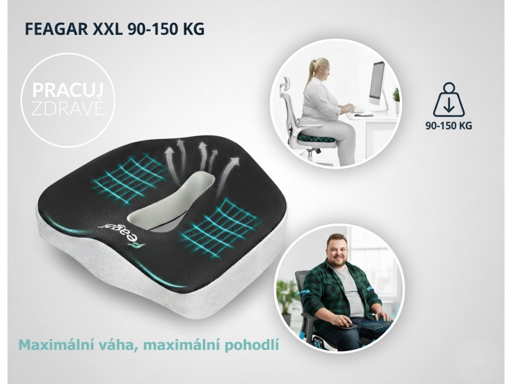 Feagar XXL - vylepšená oblíbená verze sedáku Feagar z paměťové pěny nové generace ( vysoká hustota materiálu ) vyniká ergonomickým - terapeutickým provedením a je určený pro uživatele s hmotností od 90 do 150 kg.