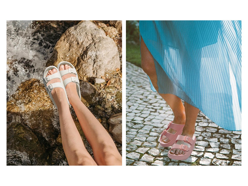 Pomocí dvou plastových přezek si snadno nastavíte šířku obuvi podle tvaru chodidla. Sandály se hodí jak na úzké, tak i na širší nohy, a jsou ideální i pro otékající nárty. Díky pevnému, ale měkkému usazení drží pohodlně na noze celý den.