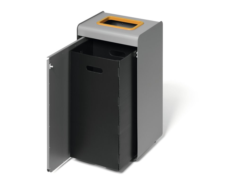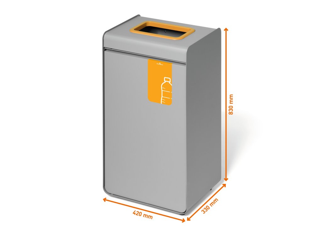 - Barevně odlišený oranžový vhazovací otvor a piktogram s motivem plastové láhve usnadňují správné třídění odpadu uživatelům v každém prostoru.