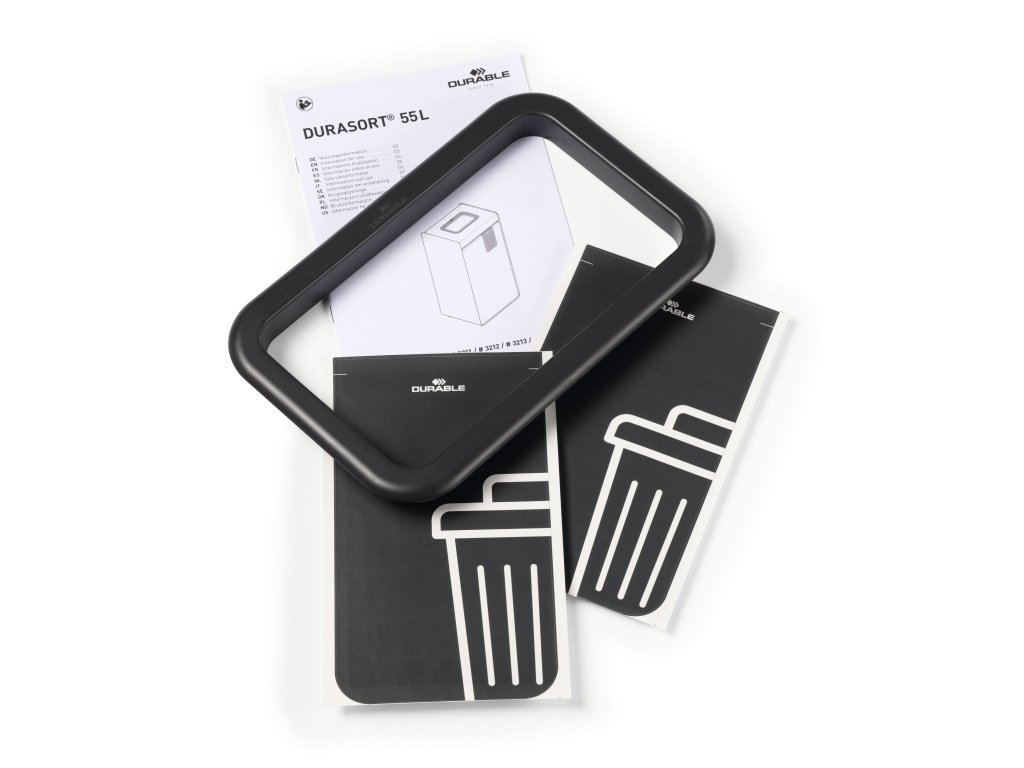 - Recyklační koš Durable Durasort 55 l je určen pro efektivní třídění směsného odpadu a zajišťuje čisté a přehledné pracovní prostředí.