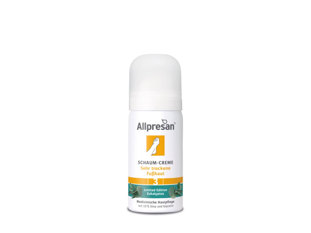 Krémová pěna Allpresan® PediCARE 3 je speciálně vyvinutá péče pro velmi suchou pokožku nohou. Kombinuje 10 % ureu, glycerin a biomimetické (kožní) lipidy, které intenzivně hydratují, pomáhají obnovovat ochrannou kožní bariéru a zanechávají chodidla hladší, pružnější a odolnější. Limitovaná edice s vůní eukalyptu dodá péči svěží, příjemný nádech.